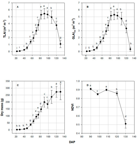 DAP effect was significant (p ≤ 0.001) for TLAI, GLAIDx, DM, and NDVI values. The TLAI reached a maximum value of 5.45 at 90 DAP (SD 10; Figure 4A). At 82, 90, and 98 DAP (SD 9, 10, and 11), TLAI did not differ (Figure 4A). The TLAI decreased after 90 DAP. TLAI at 108 DAP and later were all significantly less than that at 98 DAP (Figure 4A). GLAIDx reached a maximum value of 5.30 at 90 DAP (SD 10; Figure 4B). Samples collected after 90 DAP showed significantly diminishing GLAIDx (Figure 4B). Average DM was not significantly different between the first four sampling dates and was relatively low. It sharply increased beginning 49 DAP and continued to increase up to the last sampling date (Figure 4). The greatest NDVI values were measured at 0.91, at 90 DAP (SD 10; Figure 4D). The value was significantly less than 130 DAP (SD 14) than the previous four sampling dates, with a value of 0.51.