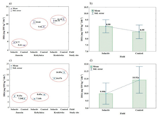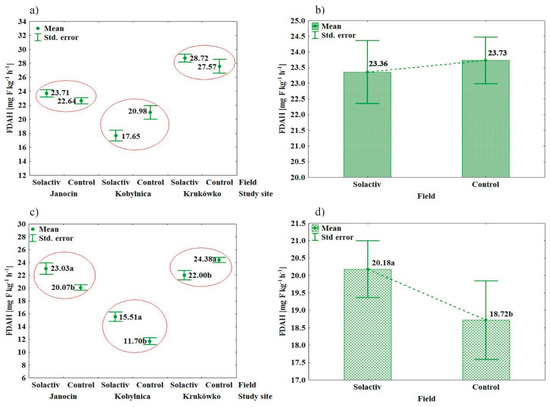 The FDAH level as affected by the tested conditioner. (a,b) I sampling (before the maize was sown, n = 10); (c,d) II sampling (after the maize was harvested, n = 10); (b,d) the mean for all study sites (n = 30). Data were analyzed using one-way ANOVA. Mean values for the conditioner and control followed by different letters are significantly different at p ≤ 0.05 according to Tukey’s HSD Test. The lack of letters indicates the lack of significance between means.