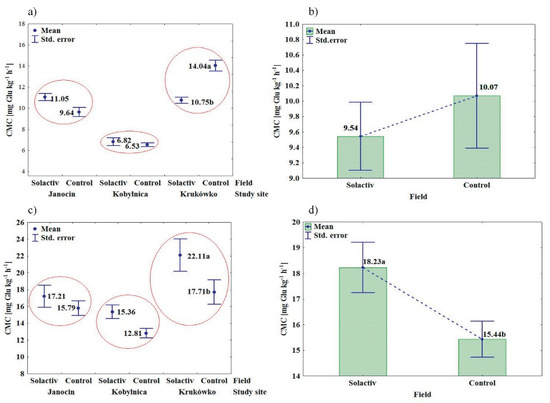 Independent of the experimental locations and fields (conditioner, control), the CMC-cellulase activity was significantly lower in the soil that was collected before the maize was sown (9.81 mg Glu kg−1 h−1) than after it was harvested (16.8 mg Glu kg−1 h−1) (Figure 3). The differences between this property in the soil that were collected from both fields (destined for the conditioner or the control) before the Solactiv was applied was not significant at any of the experimental sites. After the maize was harvested, there was only a statistical significance for two of the three sites, where the increase in the CMC activity was about 16% and 20%.