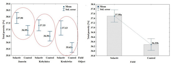 Independent of the study sites, the soil total porosity (TP) was significantly higher in the soil that was sampled from the field with the conditioner (37.6%) than in the control soil samples (36.3%) (Figure 4). This tendency was true for two of the three study sites. The higher total porosity in the field with Solactiv was closely related to the lower bulk density in this field (1.54 g cm−3) compared to the control (1.57 g cm−3) (Figure 5) and to the greater participation of the macropores (10.7%) in the TP compared to the control field (9.3%) (Figure 6).