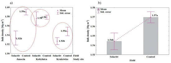 Soil bulk density as affected by the tested conditioner. (a) means for individual study sites (n = 10); (b) means for all study sites (n = 30). Data were analyzed using one-way ANOVA. Mean values for conditioner and control followed by different letters are significantly different at p ≤ 0.05 according to Tukey HSD Test. The lack of letters indicates a lack of significance between means.