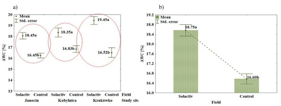 Soil AWC as affected by the tested conditioner. (a) The means for individual study sites (n = 10); (b) the means for all study sites (n = 30). Data were analyzed using one-way ANOVA. Mean values for the conditioner and control followed by different letters are significantly different at p ≤ 0.05 according to Tukey’s HSD Test.