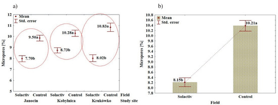 The higher TP in the field with the conditioner likely increased the available water capacity (AWC), which was 18.8% in this field but was lower in the control field (16.6%) (Figure 7). The greatest difference in the AWC between both of the fields was observed at the Krukówko study site. The AWC is usually affected by the content of mesopores, and the higher AWC in the field with the conditioner indicated a greater contribution of the mesopores in the TP. The opposite effect was observed in the case of the micropores, and thus, their content was significantly higher in the control soils than in the field with the conditioner, which was true for all of the study sites (Figure 8).