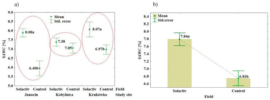 Soil SAWC as affected by the tested conditioner. (a) means for individual study sites (n = 10); (b) means for all study sites (n = 30). Data were analyzed using one-way ANOVA. Mean values for conditioner and control followed by different letters are significantly different at p ≤ 0.05 according to Tukey’s HSD Test. The lack of letters indicates the lack of significance between means.