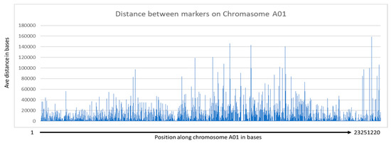 GBS identified ~300,000 SNPs among the 433 winter rapeseed lines that were sequenced. After filtering and imputation, we were left with 429 lines with 251,575 single nucleotide polymorphisms (SNPs) mapped to the reference canola genome. An analysis of the imputation program indicated that 90.67% of the total data points were correctly imputed. We found that the imputation program worked well on homozygous genotypes, imputing 99.81% of major alleles and 85.07% of minor alleles. The imputation program was unable to correctly impute any heterozygous genotypes. However, these were rare as B. napus is a primarily self-pollinating species (see below). This imputed vcf file is available as Supplemental File S2. Analysis of the imputed SNPs (Supplemental File S3) indicated that 97,666 loci (~38%) had a minor allele frequency >0.05 but that 190,375 had minor allele counts >5.0. The average expected heterozygosity for all alleles was 13.7%, which was greater than the average observed heterozygosity (6.6%), as might be predicted for a primarily inbreeding species. Seeds from these lines will be made available upon request. The distances between SNPs range from 1 base to 281,248 bases, with 4462.8 and 69 bases for the average and median distances, respectively. Marker density was not even, and clustering of markers can be observed in regions with small and large distances between markers (see Figure 1 for an example). Analysis of LD for a given chromosome is shown in Figure 2, and two range from 7 kb to ~65 kb. Regression analysis of the LD indicated that the distance between SNPs decreased sharply with R2 values greater than 0.2, with a value of 11.35 kb for the A genome and 33.88 kb for the C genome (Supplemental File S11). Thus, the marker density is sufficiently high enough to expect viable associations for most loci. More localized LD indicated a range of LD decay intervals from 1 to 491,136 bases for any given 500 kb window (Supplemental File S13). An example for the LD decay along chromosome A01 is shown (Figure 3).