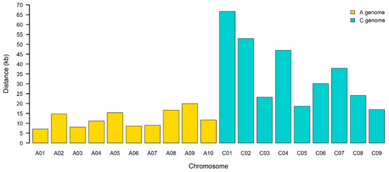 Nucleotide diversity and Tajima’s D values were calculated along the chromosomes. There was relatively little difference between the average values between the A and C genome (4.89 × 10−5 and 3.82 × 10−5 for , and 0.51 and 0.4 for Tajima’s D values, respectively) (Supplemental File S8). There were localized troughs in that corresponded to negative localized values for Tajima’s D in the same region. These may be indicative of regions undergoing some selection within the entire population. It should be noted, though, that this population is part of an active winter B. napus breeding program and thus some selection for agronomic and domestication traits might be expected.