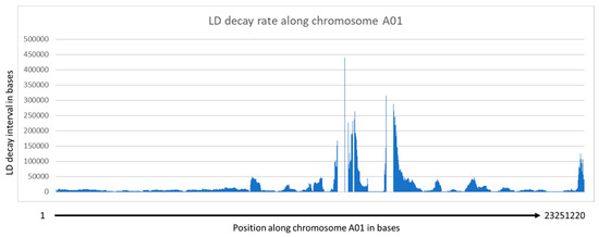 LD decay rate in bases along chromosome A01. Regions of highly repressed recombination among members of the population are observed as peaks.