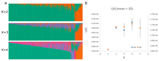 - Pritchard, J.K.; Stephens, M.; Donnelly, P. Inference of population structure using multilocus genotype data. Genetics 2000, 155, 945–959. [Google Scholar]