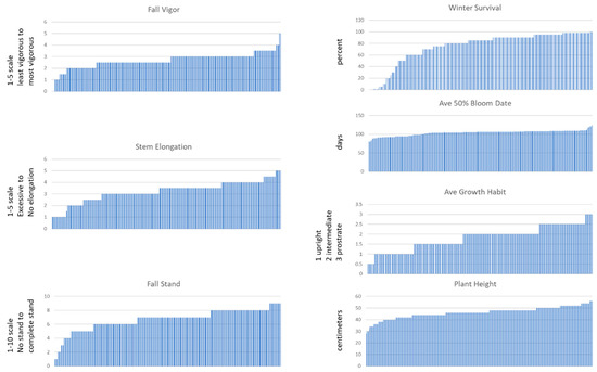 Phenotypic variations for several agronomic traits of interest within the diversity panel. Fall vigor, stem elongation, and fall stand were evaluated on a 1:5, 1:5, and 1:10 visual scale, respectively. Winter survival was an estimate percentage, average 50% bloom date was the average days to 50% flowering for 2016 and 2018, average growth habit was scored as 1 = upright, 2 = intermediate, and 3 = prostrate, plant height was the height of the topmost flowers in inches.