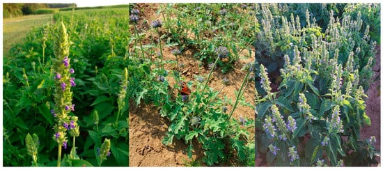 The morphological differences shown in Table 4 can be attributed to the different growth habitus of the cultivated varieties as shown in Figure 1. To state only some observed differences, which are in accordance with literature, Salvia columbariae Benth., for example, grows 10 to 50 cm tall. It develops a tap rooted, rosetted, and unbranched or sporadically branched stem. The stems emerge singly or in several branches at the base and form terminal inflorescences, subtended by a few leaves; one or more spherical clusters, each containing one dozen to several dozen flowers reaching 8 to 20 mm in diameter, also appear [38,39]. Salvia hispanica L., on the other hand, reaches growth heights of up to 1.75 m, has shallow roots, and its stem is sparsely branched and forms terminal pseudo whorl with blue or white flowers which can be more than 20 cm long [1].