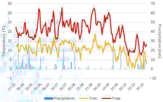 The field trial was conducted in 2018 at the experimental station Ihinger Hof (University of Hohenheim, Upper Neckarland, 48°44′40,70″ N 8°55′26,36″ E). Precipitation during the experimental period amounted to 208.5 mm. Mean temperature during the respective growing season was 17.6 °C. Meteorological data were obtained by the weather station at Ihinger Hof (Figure 2).