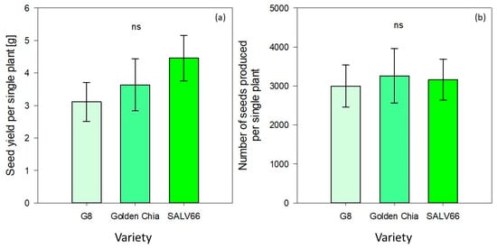 Seed weight per single plant was not significantly influenced by variety (p > 0.05) (Table 5). It ranged from 3.11 ± 0.6 (G8) to 3.63 ± 0.8 (Golden Chia) and 4.46 ± 0.7 (SALV66) respectively (Figure 3). The same applied for the number of seeds produced per single plant, which varied from 2996 ± 540 (G8) to 3260 ± 695 (Golden Chia) and 3162 ± 525 (SALV66) (Figure 3).