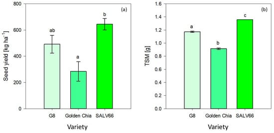 Seed yield (kg ha−1). (a) and thousand seed mass (TSM) (g) (b) of the three Salvia varieties (G8, Golden Chia, and SALV66) cultivated at Ihinger Hof in 2018. Means which share a common lowercase letter are not significant at α = 0.05. (n = 3, α = 0.05, means ± standard error bars based on model [3]).