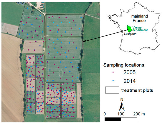 Before the installation of the treatments, in spring 2005, 400 cores (Ø 18 mm and 120-cm depth) were taken at the SOERE ACBB site with 350 located on small plots (Figure 1). Each core sample was subsequently cut to separate three depths: 0–30, 30–60 and 60–90 cm. The Poll campaign point was drawn randomly on a 10 × 10 grid principle. In addition, 76 samples were taken in triplicate at 50-cm distances to account for microscale variability. The soil samples were air-dried, sieved at 2 mm and grounded. In spring 2014, the sampling procedure was repeated at the same 400 georeferenced points complemented by 133 additional points to improve resolution (Figure 1).
