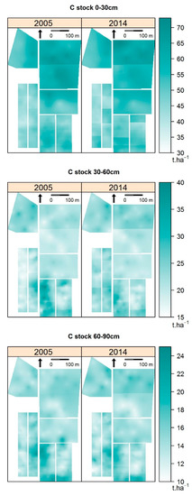 Co-kriging predicted C2005 stock and C2014 stock for 0–30, 30–60 and 60–90 cm depths.