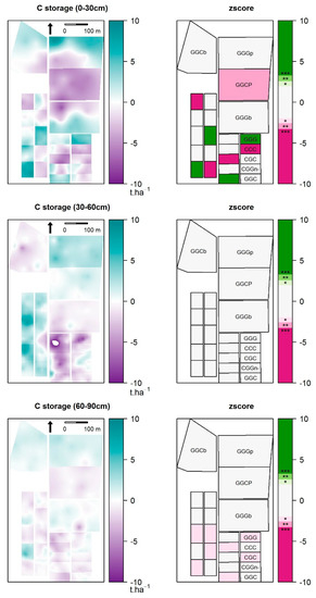 Soil C stocks (t ha−1) were calculated with Equation (2):