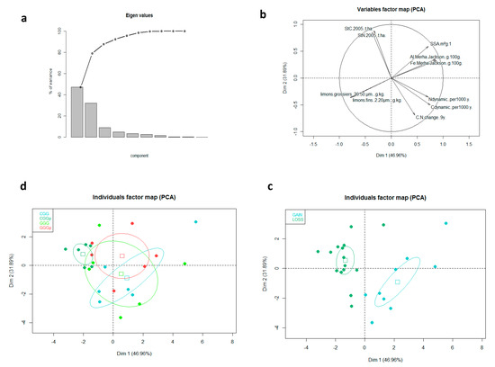 Principal component analysis for pedological soil parameters. a Eigenvalues of principal components; b Variable factor map; c Individual factor map belong to treatment; and d Individual factor map belong to gain and loss C dynamic.