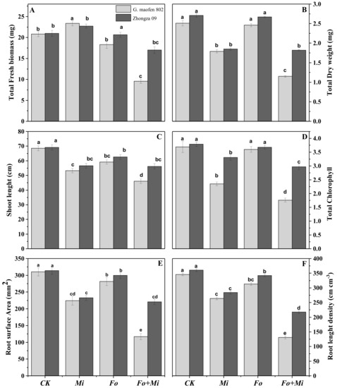 Effects of Fusarium oxysporum and Meloidogyne incognita alone and in combination on the growth (A–C) and physiological (D) and root (E,F) attributes of two tomato cultivars (G. maofen 802 and Zhongza 09) at 14 days after inoculation (DAI) under greenhouse conditions. Note: CK, non-inoculated control; Fo, Fusarium oxysporum; Mi, Meloidogyne incognita; Fo + Mi, Fusarium oxysporum + Meloidogyne incognita. Bars showing dissimilar lower-case letters are statistically different from each other at p ≤ 0.05 (Tukey–Kramer test). Values are mean ± SE.
