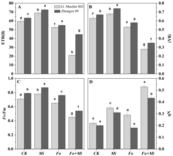 Effects of Fusarium oxysporum and Meloidogyne incognita alone and in combination on chlorophyll fluorescent parameters of two tomato cultivars (G. maofen 802 and Zhongza 09) under greenhouse conditions at 14 DAI: (A) the electron transport rate of PSII (ETR), (B) PSII quantum yield of light (YII), (C) potential quantum yield of photosystem II (Fv/Fm), and (D) non-photochemical quenching coefficient (qN). Bars showing dissimilar lower-case letters are statistically different from each other at p ≤ 0.05 (Tukey–Kramer test). Values are mean ± SE.