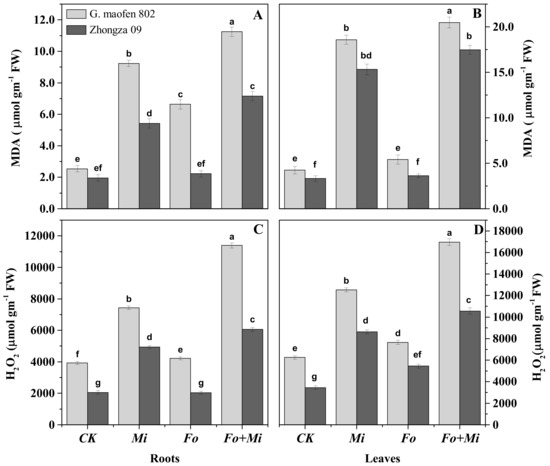 Effects of Fusarium oxysporum and Meloidogyne incognita alone and in combination on oxidative stress responses of two tomato cultivars (G. maofen 802 and Zhongza 09) under greenhouse conditions at 14 DAI.: (A) malondialdehyde (MDA) contents in roots, (B) malondialdehyde (MDA) contents in leaves, (C) hydrogen peroxide (H2O2) contents in roots, and (D) hydrogen peroxide (H2O2) contents in leaves. Bars showing dissimilar lower-case letters are statistically different from each other at p ≤ 0.05 (Tukey–Kramer test). Values are mean ± SE.