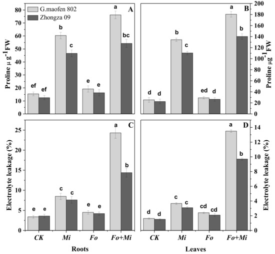 The combined application of Fo and Mi on both varieties significantly increased the electrolyte leakage and proline contents in roots and leaves (Figure 5). Proline content values were higher in roots than shoots, while maximum electrolyte leakage was observed in leaves after combined infestation of Fo + Mi in G. maofen 802 followed by Mi infestation as compared with control. In Fo application, a small increase of proline and electrolyte leakage was recorded.
