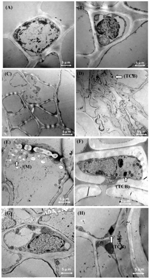 Effects of Fusarium oxysporum and Meloidogyne incognita alone and in combination on the anatomical structure of the roots of two tomato cultivars (G. maofen 802 and Zhongza 09) under TEM: (A) the healthy root cells of G. maofen 802; (B) healthy root cells of Zhongza 09 as control; (C) root cells of G. maofen 802 after Mi application; (D) root cells after Mi application in Zhongza 09 with TCB structure; (E) roots of G. maofen 802 after Fo + Mi application with mycelium (M) inside the cell; (F) root cells of Zhongza 09 after Fo and Mi application with TCB structure; (G) root cells of G. maofen 802 after single application with no TCB; (H) root cells of Zhongza 09 after single application of Fo showing unique crystalline structure near mitochondria. Note: TCB, tetra hedral crystalline bodies; M, mycelium.