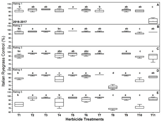 Glyphosate-Resistant Italian ryegrass Control Study in 2017 showing percent weed control. Herbicide treatments were T1 = mesosulfuron, T2 = flufenacet/metribuzin + pinoxaden, T3 = flufenacet/metribuzin followed by (fb) mesosulfuron, T4 = mesosulfuron fb mesosulfuron, T5 = metribuzin fb mesosulfuron, T6 = metribuzin fb metribuzin, T7 = pyroxasulfone, T8 = mesosulfuron, T9 = pyroxasulfone fb metribuzin, T10 = mesosulfuron fb metribuzin, T11 = flufenacet/metribuzin fb pinoxaden (standard). rating 1 in (A) was 3 weeks after treatment application (3WAT), rating 2 in (B) was 5WAT, rating 3 in (C) was 7WAT, rating 4 in (D) was 11WAT and rating 5 in (E) was 15WAT. Letters show the least squared difference between the treatments at α = 0.05.