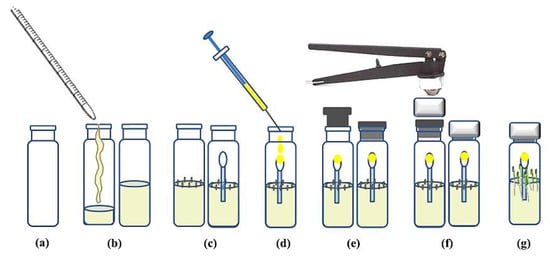 Schematic design of experiment to investigate the allelopathic effect of essential oils (Eos) by cotton swab method: (a) 20 mL vial; (b) Add 10 mL agar; (c) Insert lettuce seeds and cotton swabs after agar cooling and solidification; (d) Add EOs to cotton swabs using Hamilton syringe; (e) Rubber cap insertion; (f) Aluminum sealing and crimping; (g) Germination and seed growth after incubation.