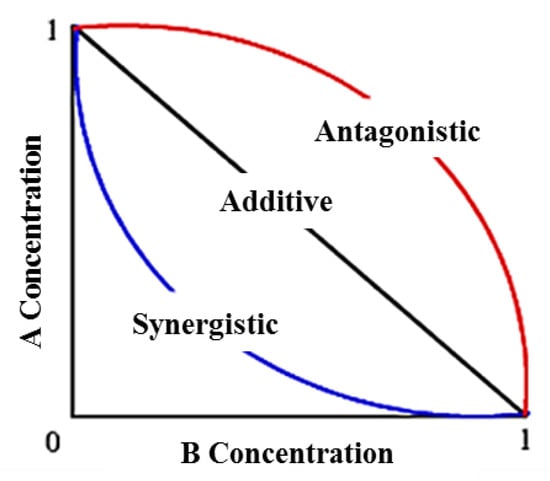 To draw these curves, the inhibitory effect of two EOs (A and B) was considered as the basis, then the concentration of A and B independently leading to similar inhibition was calculated using Quick Calcs software. Thus, there were three concentrations (A alone, B alone, and A or B in combination state) for a fixed amount of inhibition (inhibition caused by the combination of two EOs), using in isobologram curve. This curve can have three different states: (1) no curvature means additive effect, (2) upward curvature means antagonistic effect, and (3) downward curvature means synergistic effect (Figure 3).