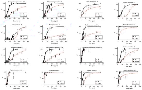Dose–response diagrams of germination inhibition and embryo lethality of lettuce affected by 16 EOs in cotton swab method. IP: Inhibition Percentage, Lethal: Lethal percentage.