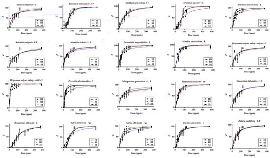 Dose–response diagrams of lettuce seedling growth affected by 20 EOs in cotton swab method. HI: Hypocotyl Inhibition, RI: Radicle Inhibition, SI: Seedling Inhibition.