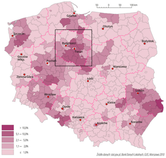 Share of sugar beet in the total cultivated area by district in 2010; the second-largest producer of sugar beets is Kujawsko–Pomorskie, marked on the map with the square shape [31].