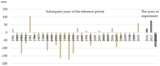 Precipitation deficiencies (−) and excesses (+) in the period of high water needs of sugar beet (July–August) in the years of the experiment, 2016–2018, in the background of the variability in the reference period, i.e., 1981–2010 (mm).