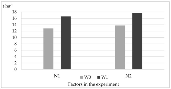 Sugar yield analysis is a derivative of the root yield analysis. Therefore, as in the root analysis, there was no significant interaction between the factors of the experiment W and N (Figure 5). The differences in the yield increments under irrigation at the nitrogen fertilizer levels N1 and N2 were similar; they amounted to 3.77 t·ha−1 and 3.87 t·ha−1, respectively. The application of nitrogen at the rate of N2 compared to N1 caused an increase in sugar yield of 0.98 t·ha−1 (6.7%) for both the rainfed and irrigated treatments.