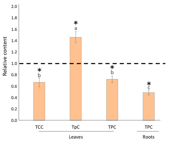 Effects of water-stress (WS) on the tomato total content of chlorophylls (TCC), proline (TpC) and polyphenols (TPC). Data for each quantification are expressed as relative content, comparing the measurements obtained for water-stressed plants with those of unstressed plants. The dotted line indicates the basal expression of NS. Absolute quantification of each parameter is also reported in Supplementary Table S2. Bars with different lowercase letters indicate significantly different values at p ≤ 0.05 as measured by a one way-ANOVA followed by a Tukey’s HSD post hoc test (see Supplementary Table S4 for additional information). The symbol “*” indicates significant differences (p ≤ 0.05) between untreated-water stressed and untreated-non stressed plants, as measured by a t-test.