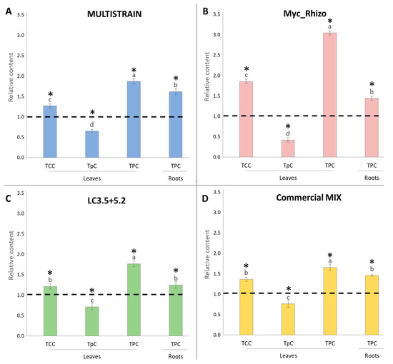 Effect of the treatment with MULTISTRAIN (A), Myc_Rhizo (B), LC3.5 + 5.2 (C) and the commercial mix (D) on the total content of chlorophylls (TCC), proline (TpC) and polyphenols (TPC) evaluated on water-stressed plants. Data for each quantification are expressed as relative content, comparing the measures obtained by treated-and untreated-water stress plants. The dotted line indicates the basal level of untreated water stressed plants. Absolute quantification of each parameter is also reported in Supplementary Table S2. Bars with different lowercase letters indicate significantly different values at p ≤ 0.05 as measured by a one way-ANOVA followed by a Tukey’s HSD post hoc test (see Supplementary Table S4 for additional information). The symbol “*” indicates significant differences (p ≤ 0.05) between treated-WS and untreated-WS plants as measured by a t-test.