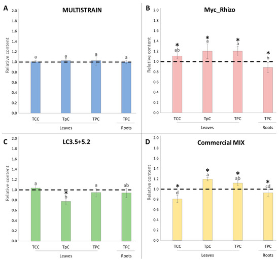 Effect of the treatment with MULTISTRAIN (A), Myc_Rhizo (B), LC3.5 + 5.2 (C) and the commercial mix (D) on the total content of chlorophylls (TCC), proline (TpC) and polyphenols (TPC) evaluated on unstressed plants. Data for each quantification are expressed as relative content, comparing the measurements obtained by treated- and un-treated-non stressed plants. The dotted line indicates the basal level of untreated-non stressed plants. Absolute quantification of each parameter is also reported in Supplementary Table S2. Bars with different lowercase letters indicate significantly different values at p ≤ 0.05 as measured by a one way-ANOVA followed by a Tukey’s HSD post hoc test (see Supplementary Table S4 for additional information). The symbol “*” indicates significant differences (p ≤ 0.05) between treated-NS and untreated-NS plants, as measured by a t-test.