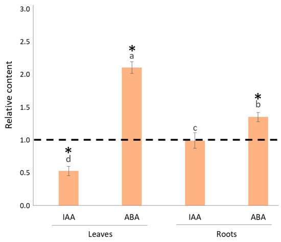 Effects of water-stress (WS) on the tomato content of indole acetic acid (IAA) and abscisic acid (ABA) evaluated both on leaves and roots. Data for each quantification are expressed as relative content, comparing the measurements obtained for water-stressed plants with those of unstressed plants. The dotted line indicates the basal expression of non-stressed plants. Absolute quantification of each parameter is also reported in Supplementary Table S2. Bars with different lowercase letters indicate significantly different values at p ≤ 0.05 as measured by a one way-ANOVA followed by a Tukey’s HSD post hoc test (see Supplementary Table S4 for additional information). The symbol “*” indicates significant differences (p ≤ 0.05) between untreated-water stress and untreated-non stressed plants, as measured by a t-test.