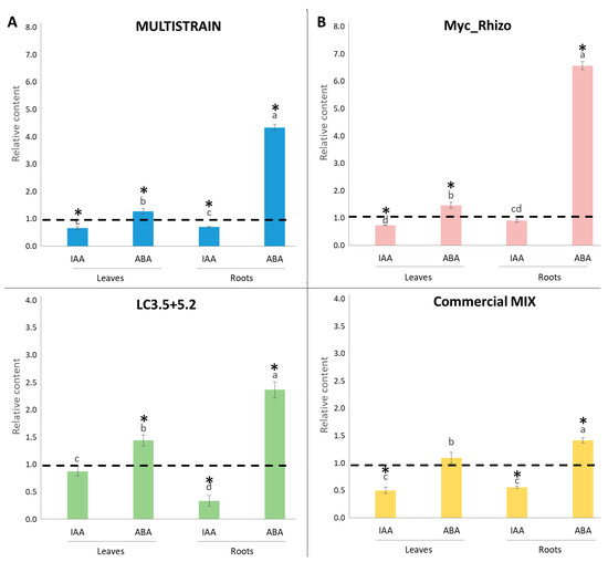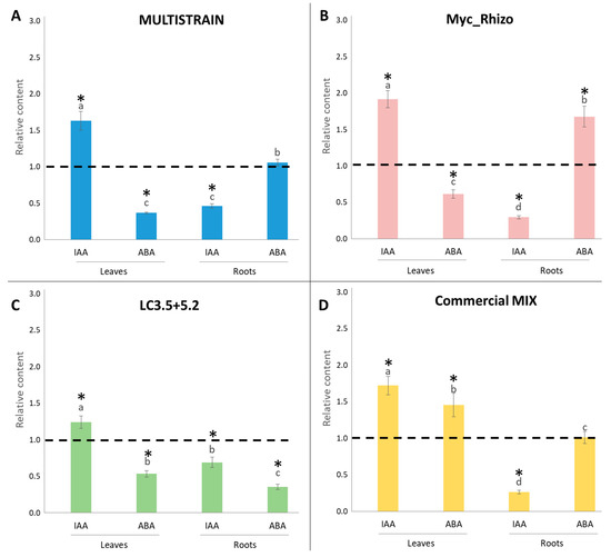 Effect of the treatment with MULTISTRAIN (A), Myc_Rhizo (B), LC3.5 + 5.2 (C) and the commercial mix (D) on the content of indole acetic acid (IAA) and abscisic acid (ABA) evaluated both on leaves and roots of water-stressed plants. Data for each quantification are expressed as relative content, comparing the measurements obtained by treated- and untreated-water stressed plants. The dotted line indicates the basal expression of untreated water stressed plants. Absolute quantification of each parameter is also reported in Supplementary Table S2. Bars with different lowercase letters indicate significantly different values at p ≤ 0.05 as measured by a one way-ANOVA followed by a Tukey’s HSD post hoc test (see Supplementary Table S4 for additional information). The symbol “*” indicates significant differences (p ≤ 0.05) between treated- and untreated-non stressed plants, as measured by a t-test.