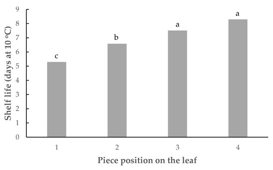 Shelf life of fresh-cut butterhead lettuce as affected by piece position on the leaf (piece one close to the leaf base and piece four close to the top), as an average of 6 cultivars and 2 leaf positions. Columns with different letters are significantly different (a < 0.05).