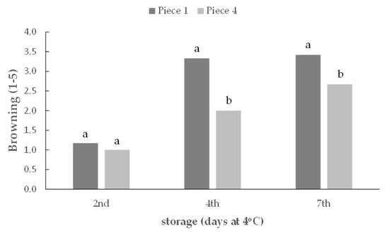 Analysis of variance (ANOVA) was performed for each storage day with variation factors of the leaf position (inner or outer) and piece position on the leaf (piece one or piece four) as well as their interaction. For the second day of storage no significant effect was observed on the browning of fresh-cut lettuce (Table 3). On the other hand, analysis of variance for the fourth and seventh day of storage showed that only piece position on the leaf had a significant effect, since most of the total variance was accounted for by differences between piece positions on the leaf (64.0% and 81.8% on the fourth and the seventh day respectively). Significantly higher browning was recorded for piece one than piece four (Figure 2). Similar results have been reported in iceberg lettuce with a significantly higher browning score for vascular tissue than photosynthetic tissue for both outer and inner leaves from the fourth and seventh day, respectively, during 10 days’ storage at 5 °C [21]. On the other hand, the effect of leaf position (outer or inner) was significant from the fourth day until the end of storage for vascular tissue, while for photosynthetic tissue the difference was significant only from the seventh day of storage [21].