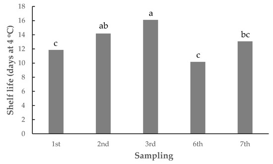 The results show a significant effect of the growing season on the shelf life of baby leaves of both species. In particularly, for spinach the shorter shelf life was observed for samples harvested at the end of the two growing seasons with the lower and higher average temperatures during the growing season (Figure 4). The highest shelf life was 16.1 days for the third sampling date (3/6), which was higher by 58% than the shelf life for the sixth sampling date (28/9). Similarly, for baby rocket, the shelf life of leaves could be clearly distinguished in the different categories by the significant differences among them. In the first group were the sampling dates from the mild seasons (3/6 and 6/9), in the second group were the samples grown under mild to extreme environmental conditions (autumn and spring), and finally the samples grown during summer (Figure 5). Moreover, the highest shelf life for baby rocket leaves was 17.7 days (sample 6/9) which was higher by 168% than the lowest shelf life of just the previous sampling date (22/7).