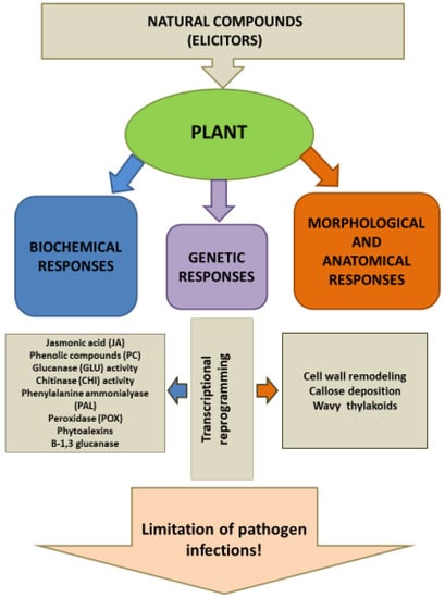 If the pathogen is able to overcome constitutive barriers, its spread may be limited by the induced modification and tightening of the cell walls [63]. As a result of plant infection, low-molecular fragments of the cell wall are released. These signals, called DAMPs, mainly include cell wall or extracellular protein fragments, peptides, nucleotides, amino acids, and are detected by plasma membrane-localized receptors of surrounding cells to regulate immune responses against the invading organisms and stimulate damage repair. The role of oligosaccharides as DAMPs in plant defense reactions against pathogens and physical agents have been well covered by several recent reviews [66,67]. Molecule fragments released from cell walls trigger genetic alterations and induce biological activity of plants. Different types of genetic transcription within cutin cells lead to cutin morphological modulation such as higher accumulation of cutin monomer [68], deposition of cell wall polysaccharides [66], callose accumulation, papillae formation, lignification and suberin synthesis, as well as accumulation of structural proteins [67]. Under the influence of elicitors, structural changes occur in association with stiffening of this structure, which limits and blocks pathogen development (Figure 1). Lignification can be a direct cause of pathogens reduction and an important element of hypersensitivity reactions, for example, in potato tubers infected with P. infestans [69]. Phenolic acids and phytoalexins are the precursors of lignin synthesis in plant cells attacked by pathogen. Lignin is a polymer that is of great importance in the body’s defense response to pathogen infection. It is resistant to enzymatic degradation by the pathogen and has a different biochemical nature depending on the host plant and type of stress factor [70,71,72]. Some natural compounds can modify plant cell wall, which in the light of the latest research reacts to external stimuli [33]. Remodeling of the cell wall, such as changes in the thickness and structure of the epidermis, degradation of chloroplasts, and the corrugated system of thylakoids, was noted in plants where defense responses were induced [58]. Marine algae and garlic extract were shown to have an impact on sweet pepper leaf blade growth and thickness [33]. Recent research has demonstrated that the action of natural compounds (elicitors) also leads to a diverse expression of plant genes responsible for triggering defense responses (Figure 1) [23,58].