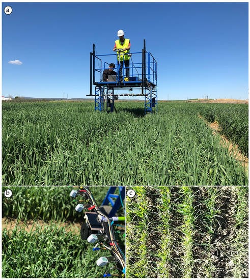 Despite indirect methods being quite accurate, the repeatability in image capture still requires time-consuming post-processing [19,25]. The development of deep neural networks, also known as deep learning (DL) techniques, a subset of machine learning (ML) and, specifically, convolutional networks (CNN or ConvNet), has emerged as a powerful less time-consuming and less costly alternative to estimate LAI and many others basic plant phenotyping tasks [35,36]. For example, Lue et al. [37] developed an in-field automatic wheat disease diagnosis system based on a weekly supervised deep learning framework using red green blue (RGB) images. A model to detect and characterize wheat spikes from wheat images as the input was designed by Hasan et al. [38]. Ma et al. [39] proposed a deep learning model to estimate the ground biomass of winter wheat from images captured under field conditions. In terms of LAI estimation, Durbha et al. [40] suggested a method based on support vector machine regression (SVR) using multiangle imaging spectroradiometry of wheat. An approach that includes images from Sentinel 2A as input and manual measurements of LAI using an LAI-2000 Plant Canopy Analyzer (Li-Cor, Inc., Lincoln, NE, USA) was proposed by Jin et al. [41] for LAI estimation in maize microplots. Houborg and McCabe [42] applied a hybrid training approach on the basis of two common decision tree regression algorithms (cubist and random forest models). These tools have demonstrated high accuracy, but low scalability for terrestrial use in a high-throughput phenotyping platform (HTPP) due to the required deployment of proximal sensors with high-resolution imaging technologies suitable to plot sizes [43]. Nevertheless, according to Tsaftaris et al. [44], many of the tools based on images developed for plant phenotyping require prior processing, and this has several drawbacks which add a new bottleneck to the breeding process. On the other hand, some researchers suggest that development in the leaf area carried out during the middle and late crop growth stages do not produce any changes in the crop canopy cover (CC) [45]. Hence, LAI values could still be increasing even when the crop canopy already covers approximately 70%–80% of the ground area. This means that LAI estimation using only data from image segmentation can be improved by adding other parameters that affects the growth and development of plants, as recently shown by Longson and Cambardella [46] who developed a statistical model to determine LAI from ground cover and plant height measurements.