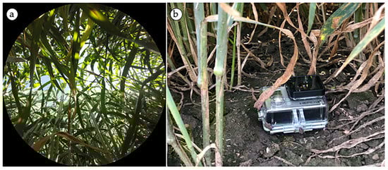 According to Jonckheere et al. [19], bottom-up hemispherical images can provide precise indirect estimates of LAI. This kind of image is captured using a fisheye-type lens that allows taking pictures with a field of view (FOV) of around 180 degrees. A GoPro camera (Hero3+, GoPro, San Mateo, CA, USA) was used in this work to take the bottom-up hemispherical images. To accomplish this, the camera was equipped with a fisheye lens with an FOV close to 170 degrees [50]. To obtain the bottom-up hemispherical images (Figure 5a) the camera was placed on the ground underneath the plants and located in the center of each plot with the interval timer shooting mode on (Figure 5b).