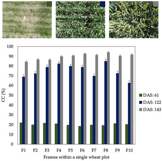 Canopy cover (CC) values for 10 frames within a single wheat plot on different days after sowing (DaS) during 2017–18 season. The error bars represent the standard deviation (SD) of the data.