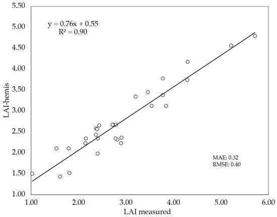 Relationship between measured LAI (direct method) and LAI estimated by bottom-up hemispherical images (LAI-hemis). The number of plots analyzed was n = 30. The straight line represents the best-fit linear regression (p < 0.001).