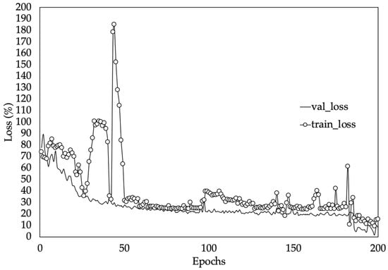 Figure 10 shows the training and validation loss (MAPE) values of the best performing model version (iv). Loss values indicate how well or poorly a certain model performs after each iteration of optimization [54]. In this case it can be observed that the mean absolute percentage error started very high but continued to fall throughout the training process. Consequently, at the end of the training process, a loss value of 12.66% on the testing set was obtained. This implies that, on average, the network will be around 13% off in its LAI predictions. In this kind of model where the dataset is made up of different types of data, the weights in the neural network are randomly initialized. Hence, slightly different results will be obtained in terms of MAPE when initialization of weights is poor.