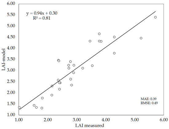 Since 20 images per plot were selected on DaS 58 for validation purposes, another set of 10 different images per plot were used again for LAI estimations, but this time using only LAI-model (iv) (Figure 9). Figure 11 shows the relationship between LAI measurements (direct method) and LAI estimates performed by this version of the model (LAI-model). The results show that the DL model performed reasonably well to predict the LAI of wheat, as denoted by the performance indicators: R2 = 0.81, MAE = 0.39 and RMSE = 0.49. Although these values are somewhat poorer that those obtained previously (Figure 9), it has to be noted that Figure 11 represents the data of the 30 plots evaluated instead of the mean values per cultivar as was done in Figure 9. As compared to the performance of LAI estimations with the hemispherical images and gap fraction theory (Figure 8), the slope of the LAI-model vs. LAI-measured relationship (0.94) indicates that the DL model did not underestimate LAI as previously observed with LAI-hemis. These results suggest that the model can be used as alternative to the hemispherical images, although keeping in mind the errors associated with the model predictions.