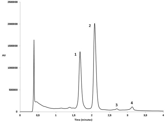 As far as the anthocyanins separation and quantification are concerned, an Elite UHPLC LaChrom Ultra System (VWR Hitachi, Tokyo, Japan) consisting of an L-2200U Autosampler, an L2300 Column Oven, an L-2160U Pumps, and an L-2420U UV-vis Detector was used. For the chromatographic separation, the column oven was adjusted to 50 °C. For the analysis, the UV-vis detector was set at 520 nm. The anthocyanins were analyzed on a HaloTM C18 Hitachi LaChrom column (100 × 3 mm I.D., particle size 2.7 µm). A gradient method, using acidified water (5% formic acid) as solvent A, and methanol as solvent B, working at a flow rate of 1.0 mL min−1, was employed for the chromatographic separation. The employed gradient was as follows: 0 min, 15% B; 1.50 min, 20% B; 3.30 min, 30% B; 4.80 min, 40% B; 5.40 min, 55% B; 5.90 min, 60% B; 6.60 min, 95% B; 9.30 min, 95% B; 10 min, 15% B. A characteristic chromatogram of the separation of the anthocyanins in açai is shown in Figure 1.